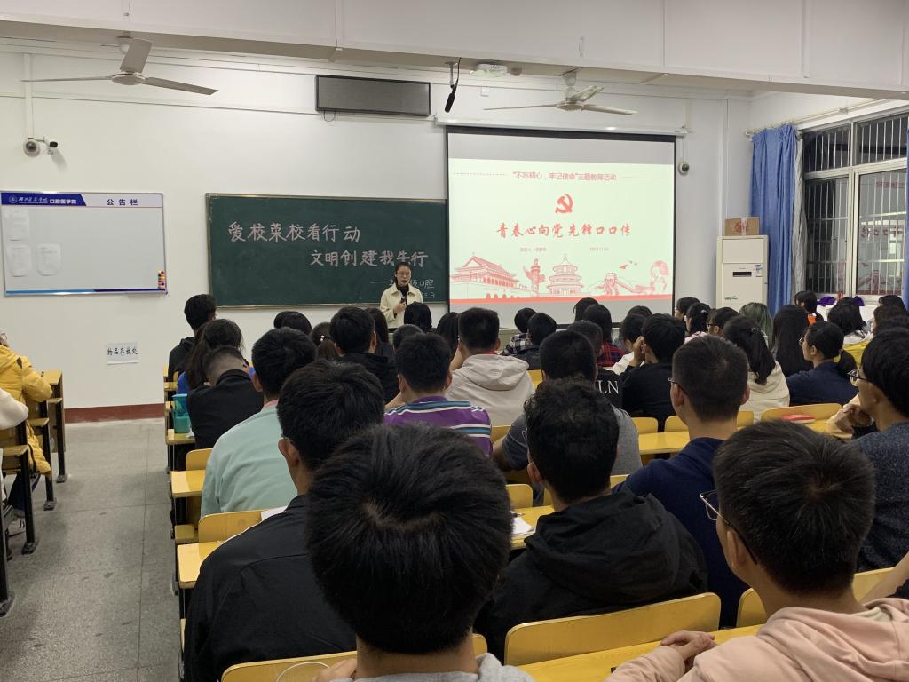 (通讯员 王刚)“我眼中的主题教育”“我为什么加入中国共产党”、“我是如何从普通学生成长为学生党员的”“学生党员发展的环节”,11月3日晚上,在ok138cn太阳集团529主题班团日现场,学生党支部王罗丹、赵国伟、陈福磊、卢超等四位学生党员带着这些主题,分别进入2016-2019级口腔班级,将“不忘初心 牢记使命”主题教育向团支部、向青年学生延伸宣讲,他们结合参加主题教育体会讲述青年党员眼中的主题教育;结合个人的成长,向同学们讲述自己入党初心和如何通过努力加入中国共产党;如何做好一名学生和学生干部;学生成长成才等不同角度进行主题宣讲。讲解的过程中,以“不忘初心、牢记使命”作为宣讲立意与落脚点,立足生活学习实际,宣传党的理论路线政策,取得很好的效果。