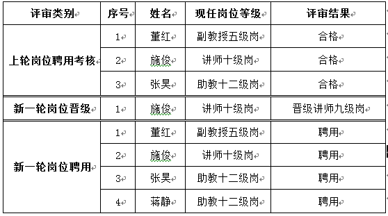 依据学校人事处《关于做好教师上轮岗位聘期考核、新一轮空岗晋级及岗位聘用工作的通知》要求,学院教师岗位聘用工作小组在对学院教师提交的前期综合材料审核、公示的基础上组织评审,评审结果如下: