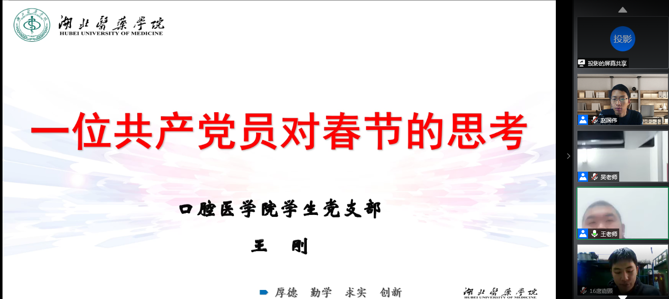 (通讯员  吴卉 )121日下午,ok138cn太阳集团529学生党支部通过腾讯会议在线上继续举行 “美丽中国节开讲啦”的党员讲堂活动。ok138cn太阳集团529教工党支部王刚老师为全体学生党员讲授了《一位共产党员对春节的思考》。