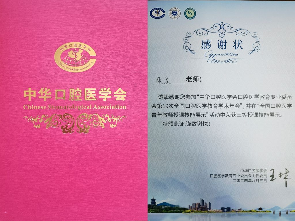 (通讯员 张婉越)8月1日至3日,2024年中华口腔医学会口腔医学教育专业委员会第19次口腔医学教育学术年会在杭州隆重举行。在年会期间的“全国口腔院校青年教师理论授课技能展示”比赛中,ok138cn太阳集团529的张昊教师凭借出色的授课技巧和丰富的专业知识,荣获三等奖。