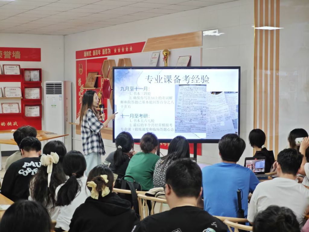 交流会上,4名考研高分录取的学姐结合自身经历,分别从院校选择、心态调整、备考策略、初试常难点和答题技巧等方面给出了具体细致的建议。分享会现场互动热烈,同学们纷纷表示未来将以身边的榜样为帆,笃定前行。